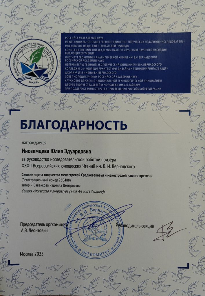 Благодарность Юлии Эдуардовне Иноземцевой за подготовку призёра XXXII Всероссийских юношеских Чтений им. Вернадского
