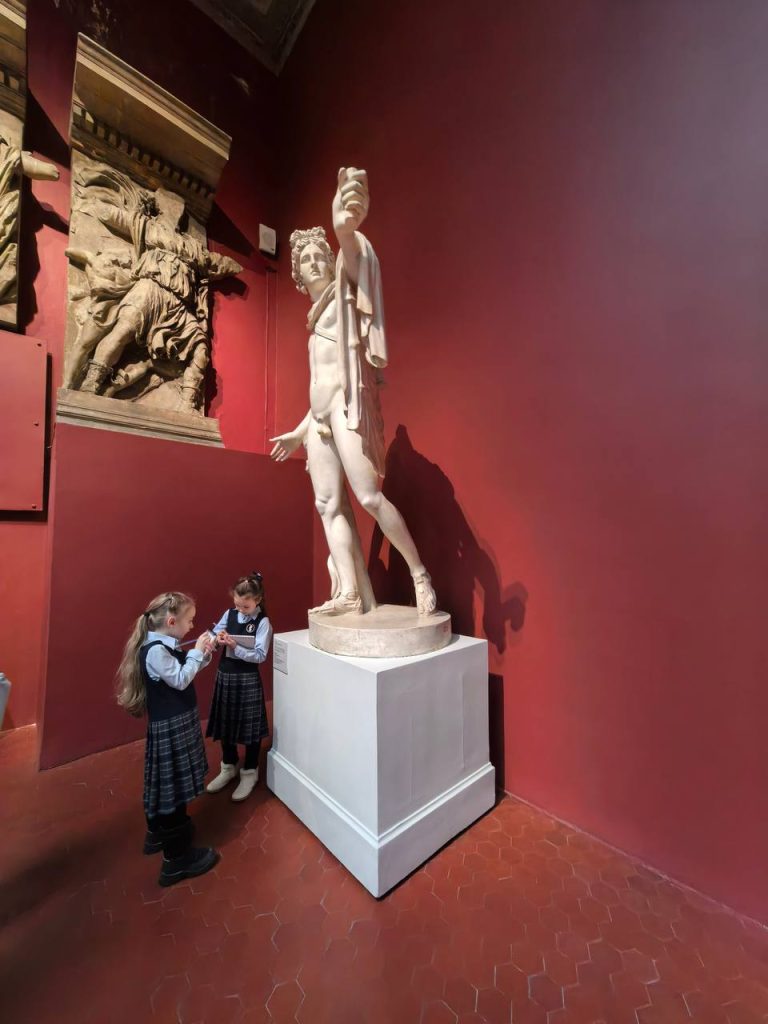 В залах скульптуры лицеисты увидели эволюцию греческих статуй: от архаических куросов, которые делают шаг, удлиняя ногу, до идеальных по изображению движения скульптур Поликлета.